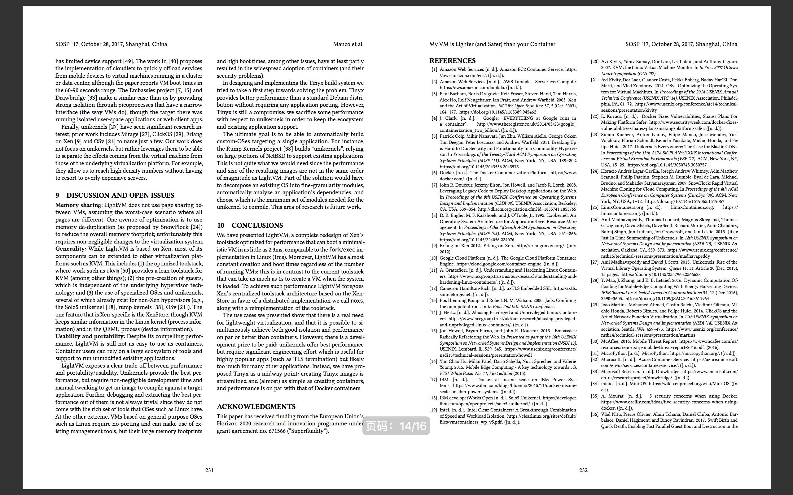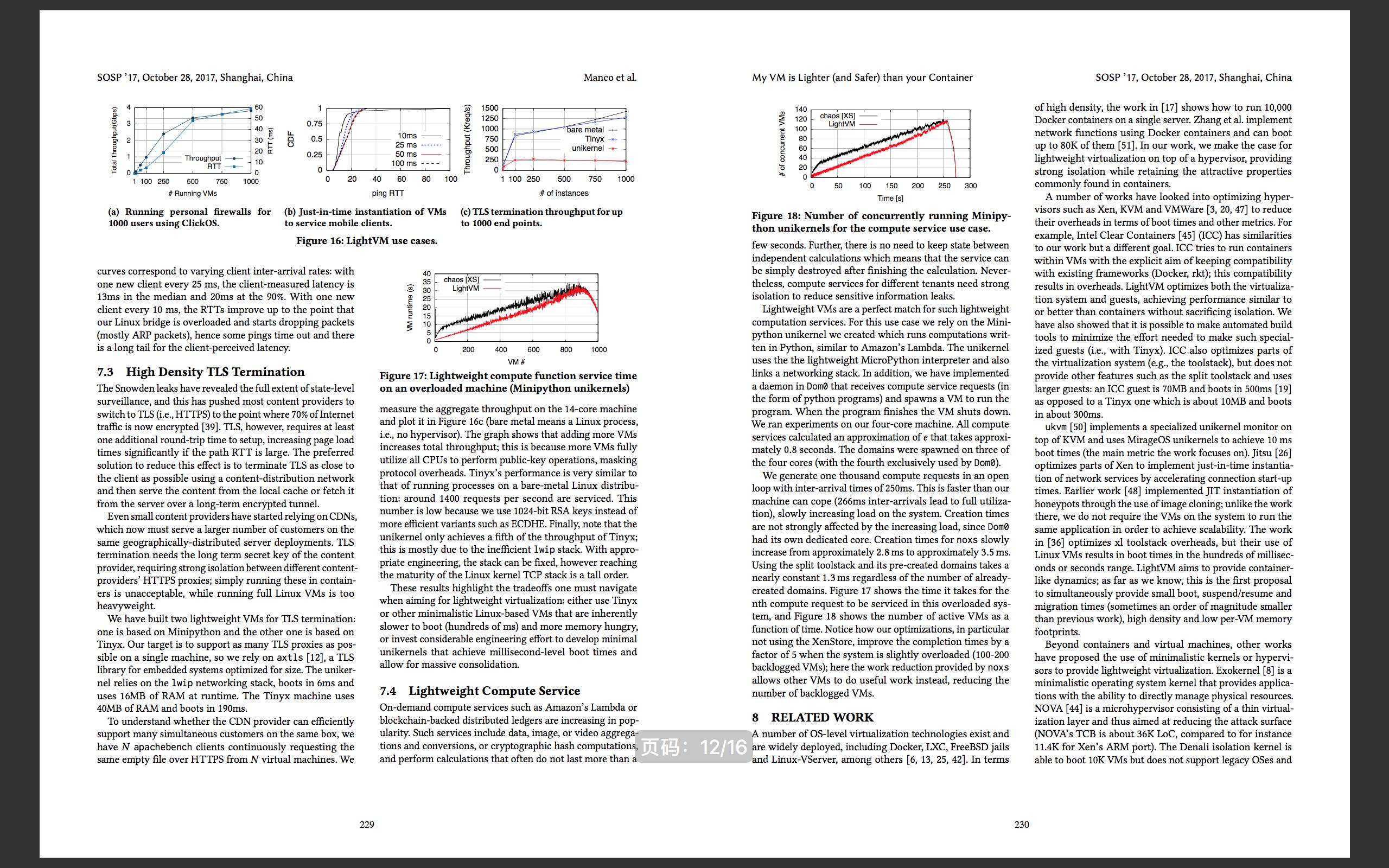 我们介绍的使用场合表明,确实需要轻量级虚拟化,而且在获得良好隔离的同时,还能获得与容器同等或更好的性能。