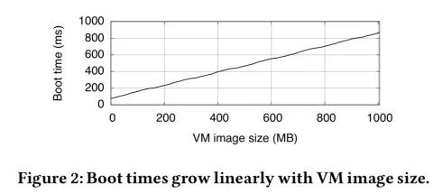 如下图所示,限制虚拟化可伸缩性和性能的最大一个因素是来宾虚拟机的大小。为了制作该图,从ramdisk启动unikernel虚拟机,不同大小的二进制对象注入到未经过压缩的镜像文件。所以所有影响与镜像大小有关。