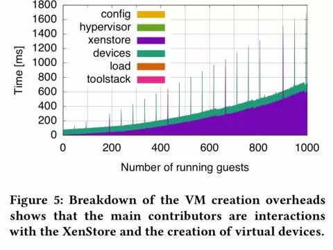 XenStore交互和设备创建占了大头。其中,设备创建的开销相当稳定,但是XenStore开销呈超线性增加。
