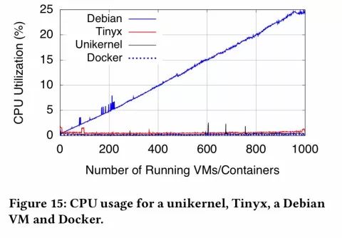 虚拟机的CPU使用情况也与容器相当,只要虚拟机经过简化,只包括必要的功能: