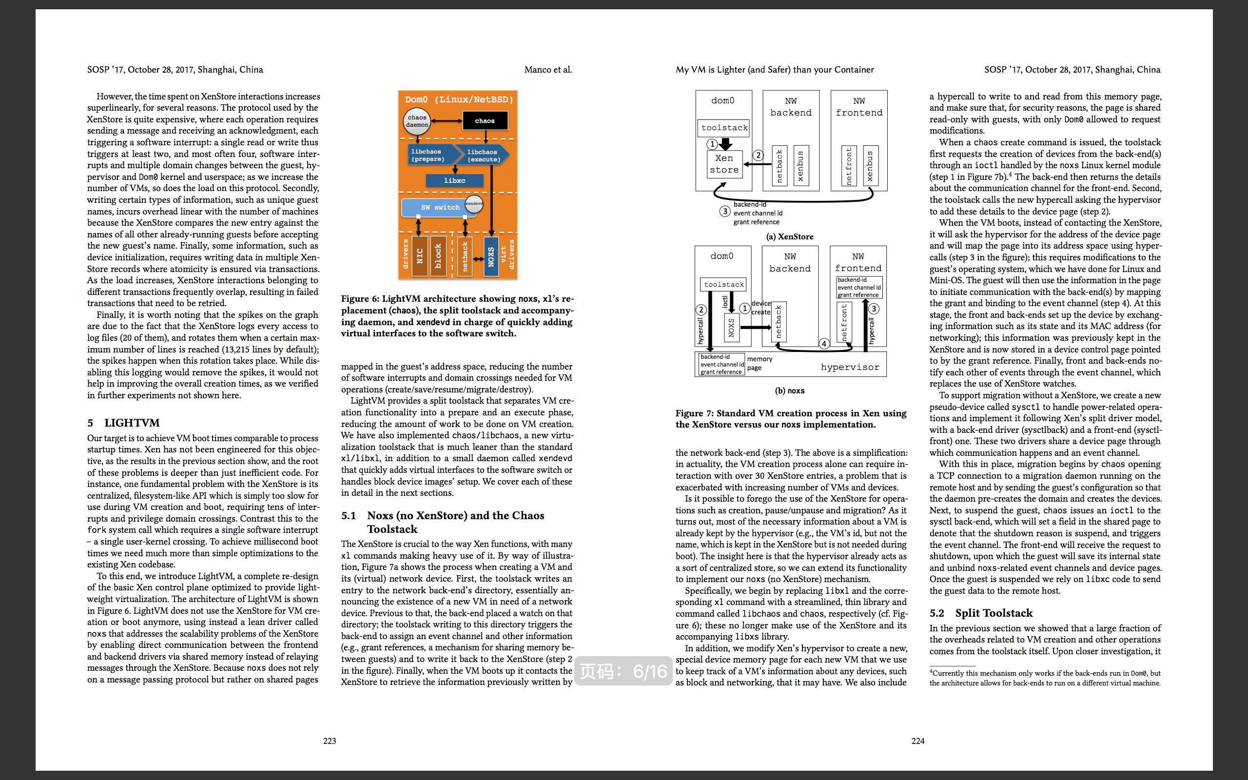 LightVM重新设计了Xen控制平面,使用一种名为noxs(意为“noXenStore”)的精简驱动程序来取代XenStore,并允许前端驱动程序和后端驱动程序之间通过共享内存来直接联系。