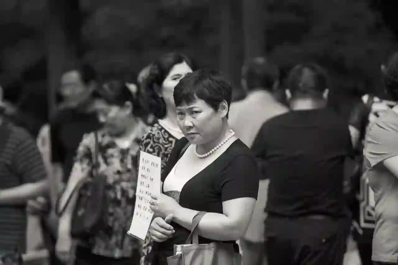 我当时只是想拍一些照片,一开始我没觉得这些照片能成为什么,也不知道拍出来是什么样子。回家整理的时候,我把它们全都打印出来摆在地上看,结果发现照片中的那些脸,那些代替子女去相亲的父母的脸,特别是母亲们的脸上全是焦虑。这些表情都是抓拍的,但没有一张看起来很开心的脸,都很焦虑,特别焦虑。