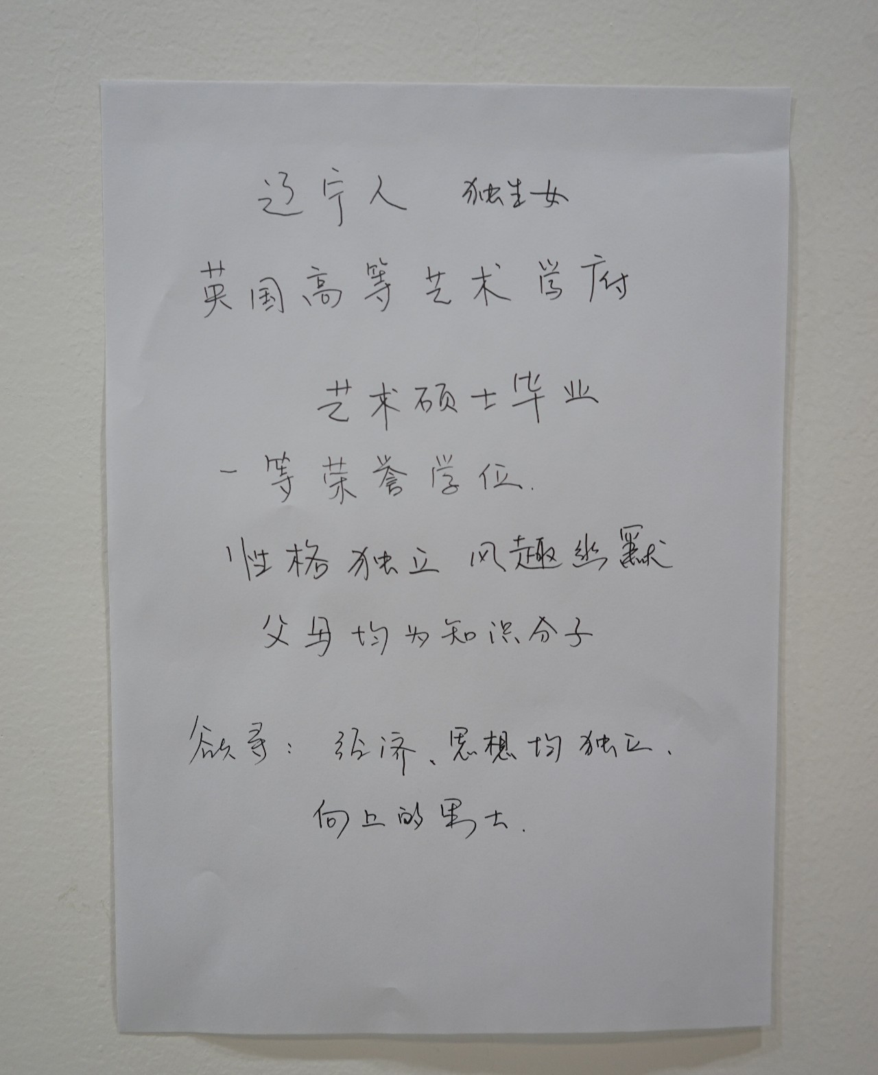 有一个细节特别触动我。我看见一个妈妈用夹子夹自己孩子的个人介绍,来来回回地夹,这个反复的动作在我看来是很疼的,我觉得那不是一张纸,而是一个活生生的人,你把它拎出来,晾在那里,被挑选。