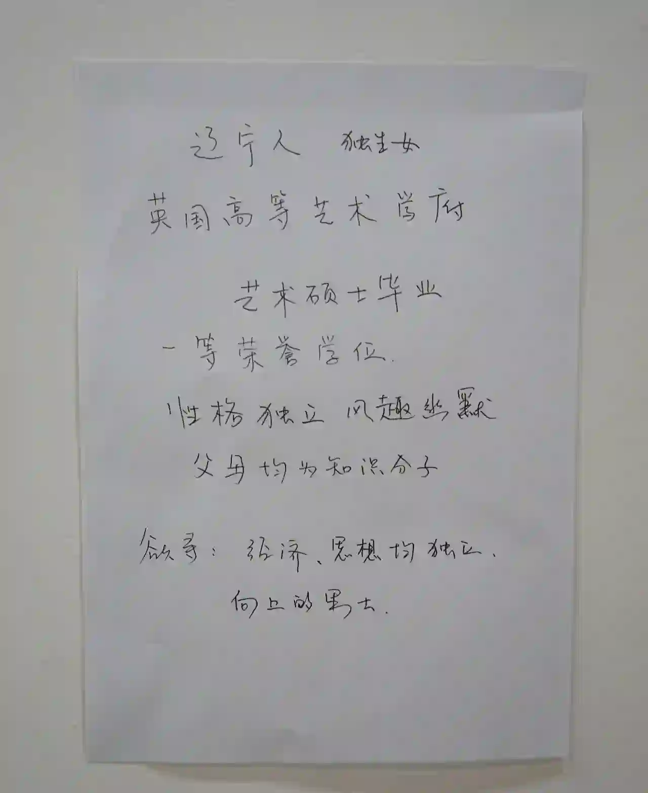 在自己的相亲广告上,我写了一些自认为值得骄傲的品质,比如性格独立,风趣幽默,英国高等艺术学府艺术硕士毕业,一等荣誉学位,父母都是知识分子等等。我故意没写年龄,因为我想看看他们衡量一个女性的标准是不是只有年龄。