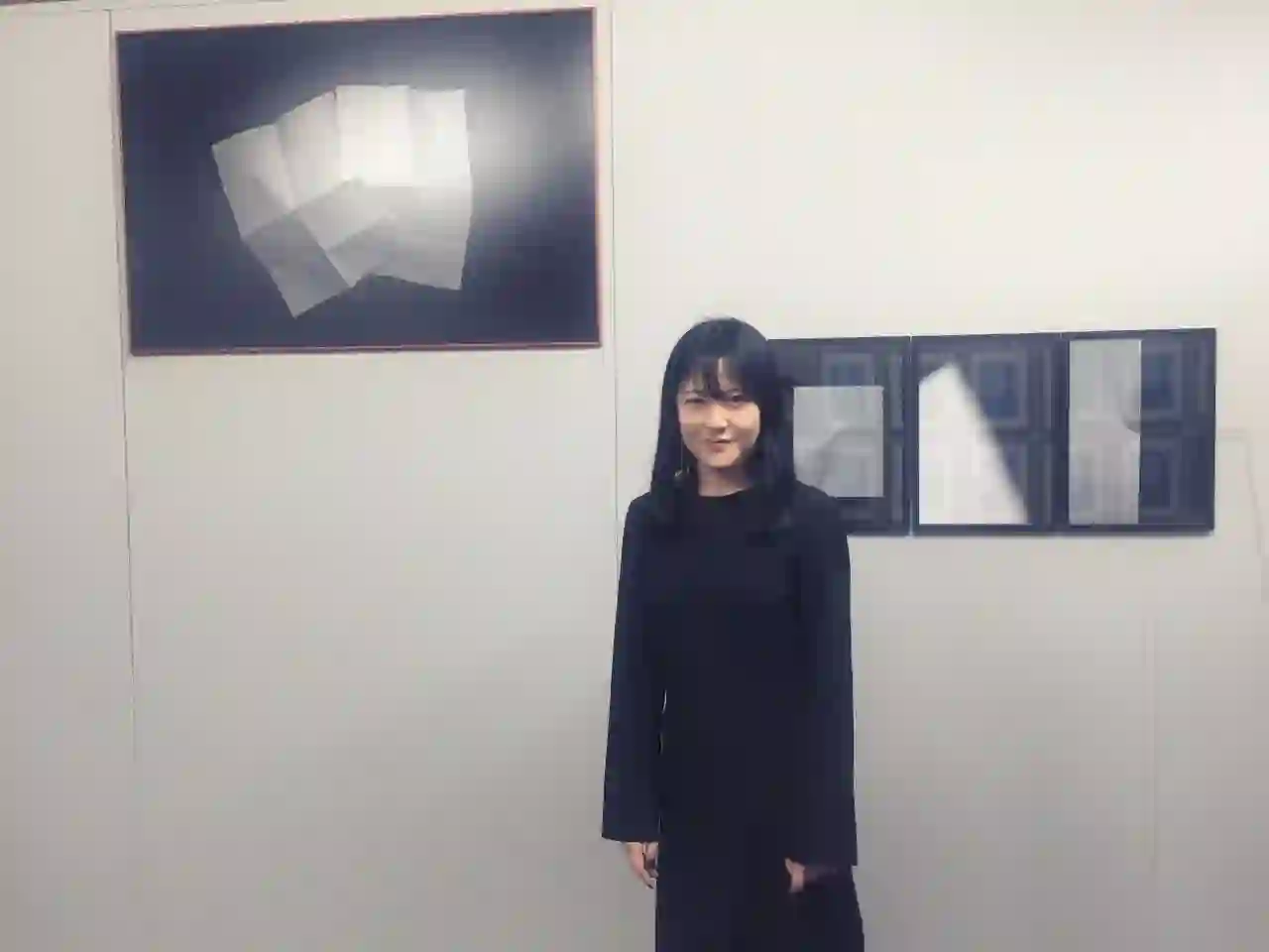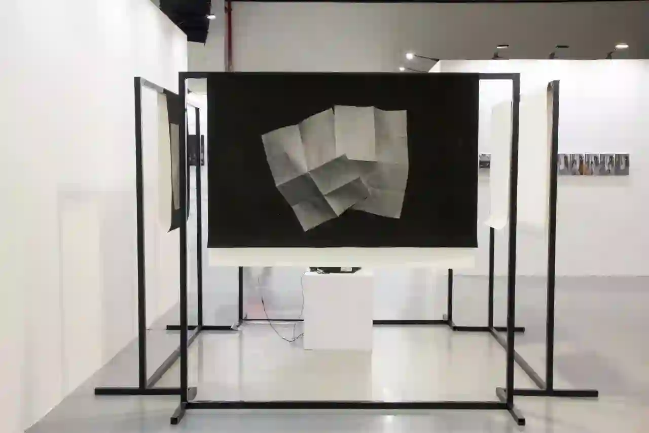 郭盈光的作品在国内展出,两张褶皱交叉的纸,象征着两个被安排、被挑选的人。