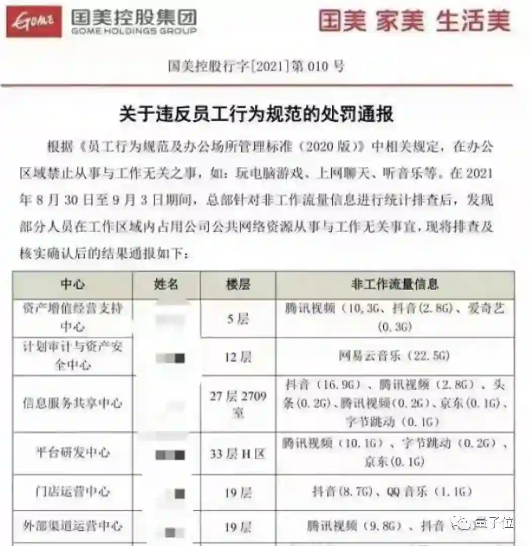 和下班发电量消耗截图类似,国美集团也被曝出直接统计每位员工在工作时间用于刷视频、打游戏等情况时消耗的流量,精确到每个应用用了几点几G。
