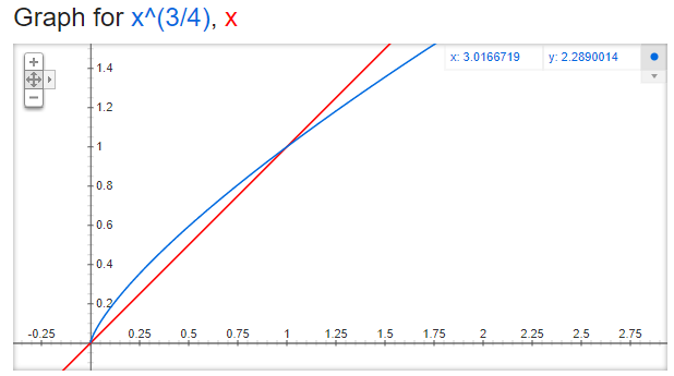 这个「改变后的公式会产生一个效果,就是稍微增加低频词的采样概率,降低高频词的采样概率」。可根据下图(google的搜索栏中输入“plot y = x^(3/4) and y = x”可以快速画图)的对比看出来: