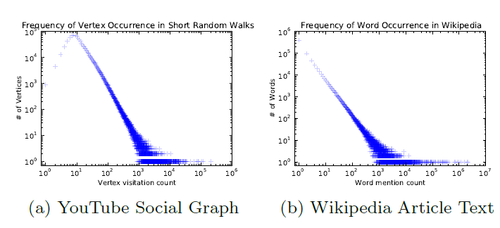 「解释性」,论文中提到,在图中通过随机游走得到序列的节点分布规律与NLP中句子序列在语料库中出现的词频规律有着类似的幂律分布特征,见下图。在自然语言里面,幂律分布特征可以理解为只有少量的单词出现频率非常高,而绝大部分的单词出现的频率较低,还可以理解为,在日常交流中,常用的词汇很少,而绝大部分的词汇并不常用,可以看出随机游走路径显然符合自然语言的特点,从某个角度说明随机游走采样生成序列的合理性。