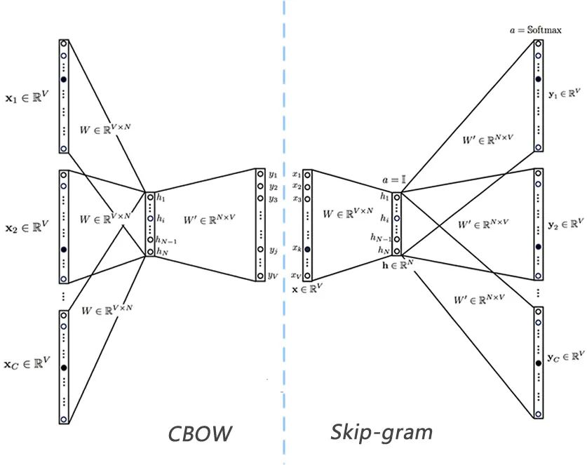其实就是上面的「权重矩阵」 和 (对Skip-gram来说,分别对应损失函数公式中的中心词词向量 和上下文词向量 ),这「两个都可以作为最终的向量化表示矩阵」,只是一个靠近输入空间,一个靠近输出空间,具体选择哪个,理论上没有什么区别。不过我个人更倾向于选择靠近中心词一端的权重矩阵,比如CBOW选择 ,而Skip-gram选择 ,在Word2Vec使用的Skip-gram就是选的 ,「另外有些时候还可以尝试用两个矩阵的平均或者两个矩阵对应词向量的拼接作为最终Embedding」。