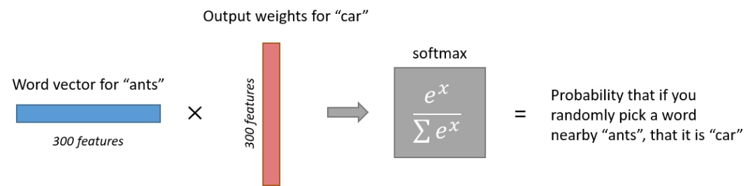 同理,输出层向量的值可以通过隐含层向量,以及连接隐含层和输出层之间的 维权重矩阵 计算得到。输出层也是一个 维向量,每维与词汇表中的一个单词相对应。最后,对输出层向量应用Softmax激活函数,可以计算出每个单词的生成概率。