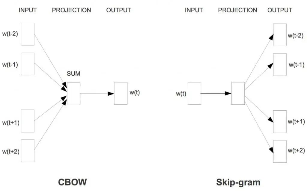 CBOW和Skip-gram都可以表示成由输入层(Input)、映射层(Projection)和输出层(Output)组成的神经网络。
