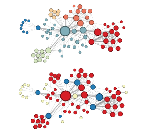 所以,「DFS相当于对网络结构进行了一次宏观扫描」(macroscope view),只有在宏观的视角,才能发现大的集团、社区的聚集性,和集团内部节点的“同质性”。