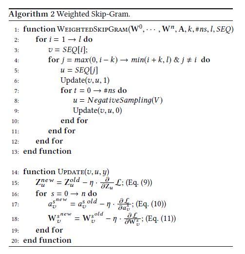 该模型将传统Skip-gram模型进行了改进,加入Side Information以及加权平均层,成为Weighted Skip-gram模型,其中: