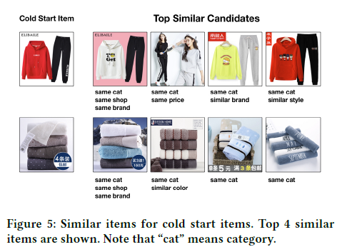 下图是论文在获取到冷启动item的Embedding后,比较了与冷启动item的Embedding最相似的Top 4个物品,用来评估Embedding的质量。从结论来看,相似的Embedding确实有很多相似的Side Information,这种冷启动方法效果还不错。