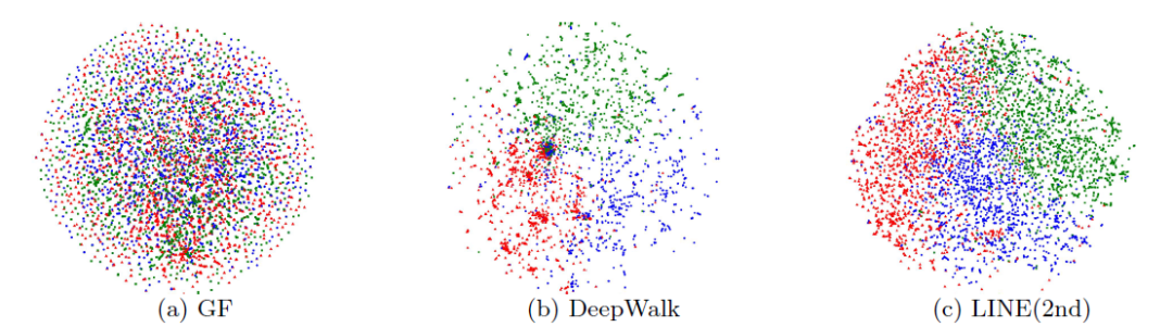 相比 DeepWalk 纯粹随机游走的序列生成方式,LINE 可以应用于有向图、无向图以及边有权重的网络,并通过将一阶、二阶的邻近关系引入目标函数,能够使最终学出的 node embedding 的分布更为均衡平滑,避免 DeepWalk 容易使 node embedding 聚集的情况发生。下图是论文中的结果对比: