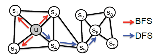 广度优先抽样(BFS):邻域被限制在起始节点的近邻节点上,与初始节点在同一社区内的节点更容易出现在一个路径里。在上图中,对于大小为k=3的领域采样,BFS采样节点s1、s2、s3。