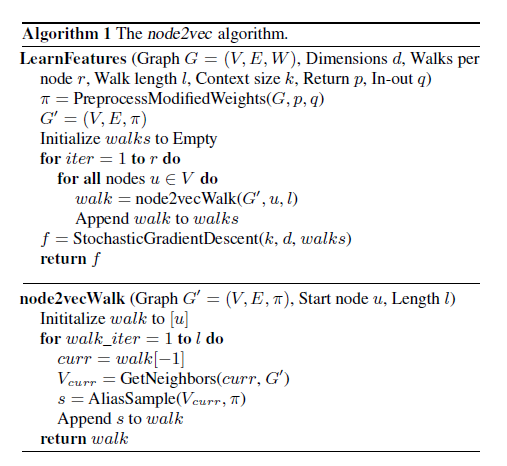 上式利用参数 和 共同控制着随机游走的倾向性,来选择BFS 还是 DFS,从而控制对结构性或同质性网络关系的学习。