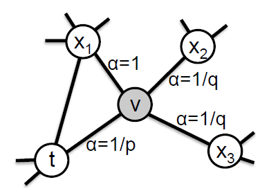 其实DFS还是BFS,主要还是通过节点间的跳转概率来控制的,以下图为例,我们假设第一步是从t随机游走到v后,这时候我们要确定下一步的邻接节点。