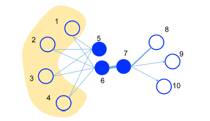 Second-order proximity(二阶相似度):网络中的很多相互关系其实不一定能够直接观察到,仅有一阶相似度并不能保留全局网络结构,因此作为补充,加入了二阶相似度。二阶相似度并不是通过直接观察到的连接来确定的,而是通过顶点的共享邻域结构来确定的。如下图,虽然节点 5 和 6 之间不存在直连边,但是他们有很多相同的相邻节点 (1,2,3,4),这其实也可以表明5和6是相似的,二阶相似度就是用来描述这种关系的,拥有相似邻居的顶点往往彼此相似。其实二阶相似度也是符合自然的直觉的,例如,在社交网络中,拥有相同朋友的人往往有相似的兴趣,从而成为朋友;在单词共现网络中,总是与同一组词同时出现的词往往具有相似的含义。二阶相似度形式化定义为,令 表示顶点 与所有其他顶点间的一阶相似度,则 与 的二阶相似度可以通过 和 的相似度表示。若 与 之间不存在相同的邻居顶点,则2阶相似度为0。
