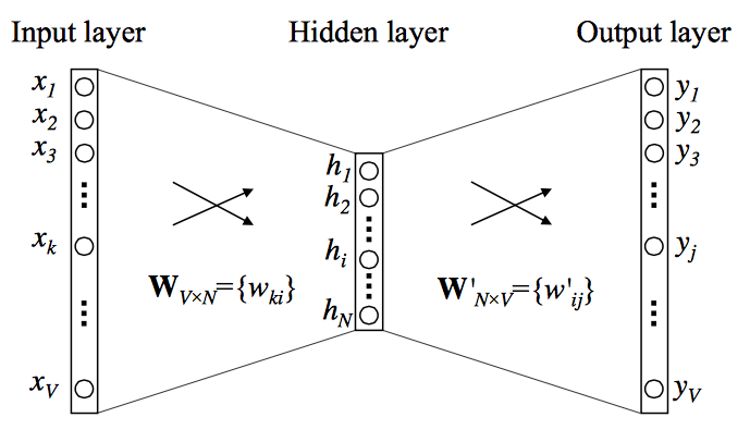 于是设 为中心词w的词向量, 为上下文词c向量,向量维度等于设置的隐藏层单元数量。整个语料共有V个单词,也就是词汇表单词数。