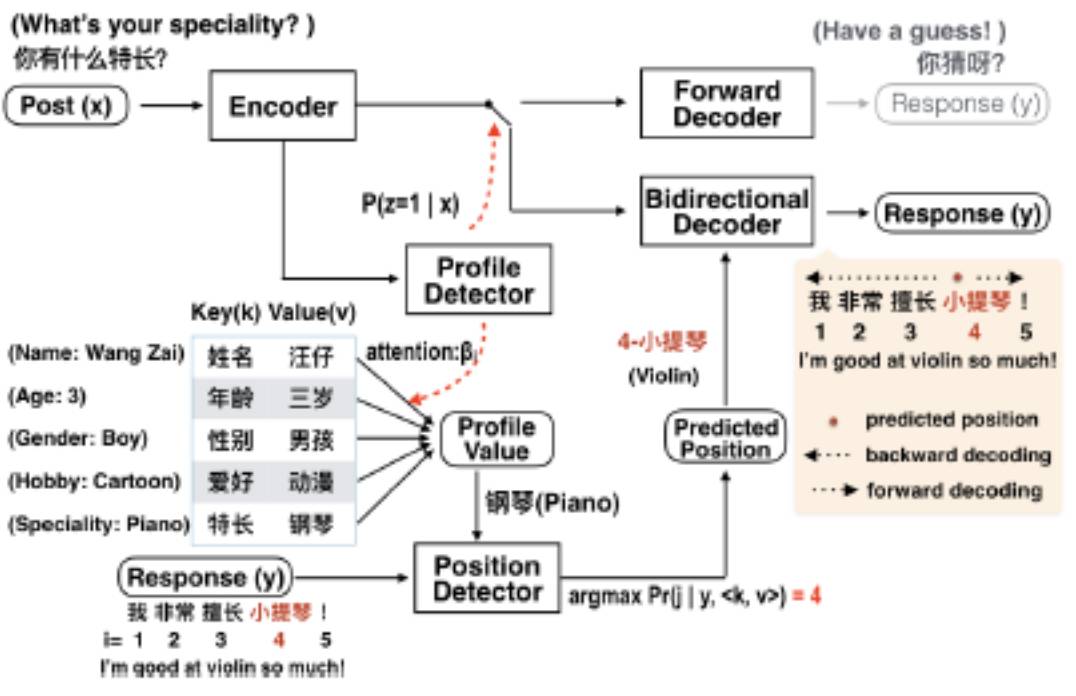 细节剖析:其中的编码器(Encoder)是将 post 编码成向量,以便后续深度生成模型利用。属性检测器(Profile Detector)在这里有两个目的:一是判断给定的 Post 是否涉及机器人自身的属性,二是判断涉及了哪一条属性,将检测到的属性 <key,value> 放入相应的解码器中。双向解码器(Bidirectional Decoder)的目的是生成一个涉及机器人属性的反应 (Response(y)),在测试阶段以机器人的属性值(Profile Value)为起点来生成整个序列。双向解码器这一点是受到了牟力立同学在 2016 年发表的一篇论文(Mou et al., 2016)[1] 启发,他们的工作是通过双向解码器生成包含限制条件的回复。与之不同的是,在训练过程中我们使用了 Position Detector 去预测关键词的位置,取代了(Mou et al., 2016)工作中随机替换关键词训练 Decoder 的方法。