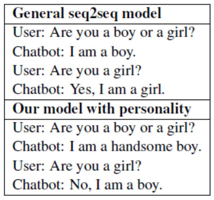 拥有“一致人格”的聊天机器人技术还十分不成熟,而对话中如果没有一致人格会出现什么问题呢?会对使用者来说产生什么困扰呢?举个例子,当你问某个 chatbot “你多大了?”,她可能会回复你“我啊……反正是九零后”,然后你接着问“你是九零后吗?”,她可能会回复“八零后”,非常直观。同样的问题想得到一致的回答,也就是将固定的只是或者人格整合进模型在目前看来其实是十分困难的,使用传统的 seq2seq 模型学习如何生成语义合理的回复,但它们没被训练如何生成一致回复的语义,因此在反复相同的语义输入时会出现不同的回复。