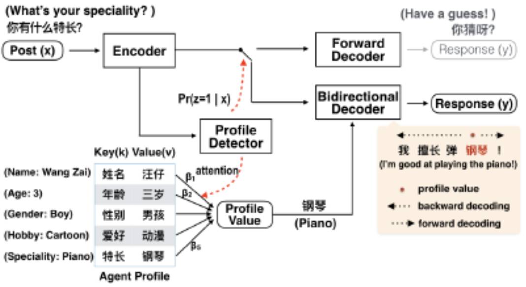 方法思路介绍:如下图所示,本文模型包含三个重要的子模块。首先,为了判断给定的 Post 是否涉及机器人自身的属性,以及涉及了哪一条属性,属性检测器(Profile Detector)将对给定的 Post 进行分类。训练 Profile Detector 的过程中使用了带有噪音的监督数据。若分类结果不涉及机器人属性,则使用传统方法 seq2seq 解码。若分类结果涉及机器人属性,则使用双向解码器(Bidirectional Decoder)以属性值为中心进行双向解码。Bidirectional Decoder 是通过与属性相关的 <Post, Response> 数据训练的。