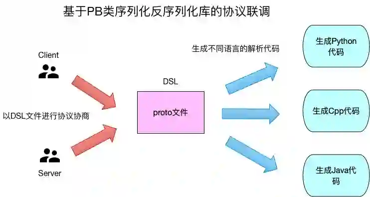 使用proto格式文件来定义协议格式,proto文件是一个典型的DSL(domain-specific language)文件,文件中描述了协议的具体格式,每个字段都是什么类型,哪些是可选字段哪些是必选字段。有了proto文件之后,C\S两端是通过这个文件来进行协议的沟通交流的,而不是具体的技术细节。