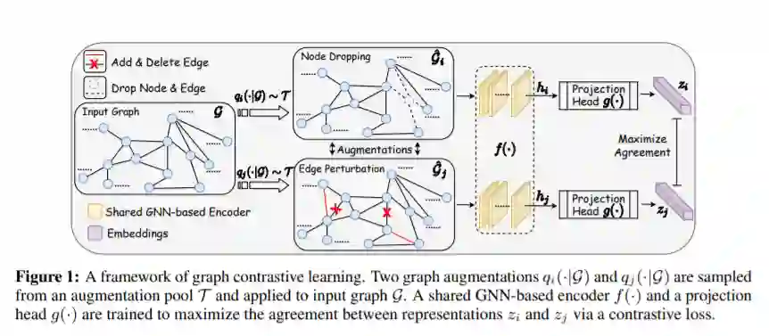 对于当前的图神经网络(GNNs)来说,图结构数据的可泛化、可迁移和鲁棒表示学习仍然是一个挑战。与为图像数据而开发的卷积神经网络(CNNs)不同,自监督学习和预训练很少用于GNNs。在这篇文章中,我们提出了一个图对比学习(GraphCL)框架来学习图数据的无监督表示。我们首先设计了四种类型的图扩充来包含不同的先验。然后,我们在四种不同的环境下系统地研究了图扩充的各种组合对多个数据集的影响:半监督、无监督、迁移学习和对抗性攻击。结果表明,与最先进的方法相比,即使不调优扩展范围,也不使用复杂的GNN架构,我们的GraphCL框架也可以生成类似或更好的可泛化性、可迁移性和健壮性的图表示。我们还研究了参数化图增强的范围和模式的影响,并在初步实验中观察了性能的进一步提高。