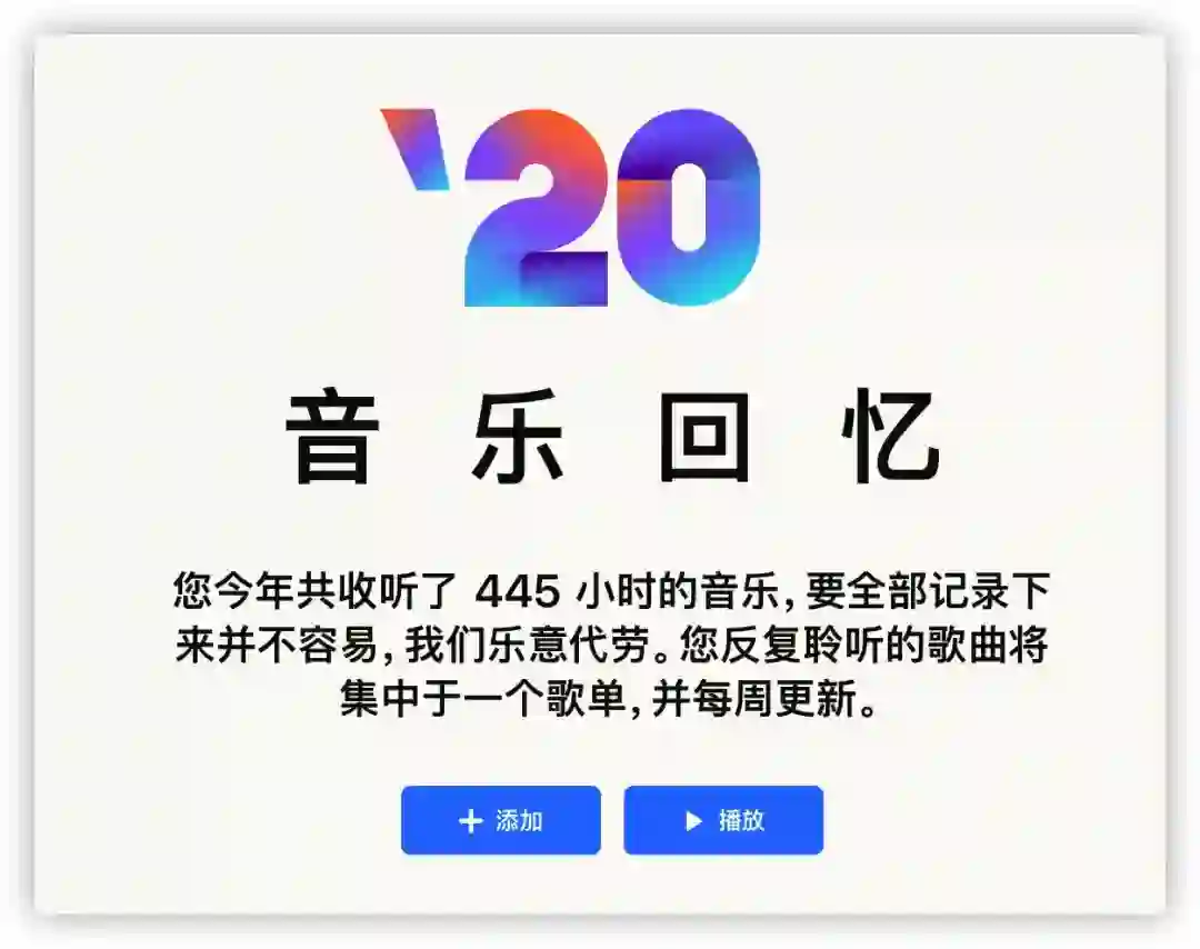 ▲ Spotify 2018 Wrapped 音乐总结而且可能是基于保护用户隐私的考虑,Apple Music 的音乐回忆总结中只罗列了歌曲、专辑和艺人三种数据,不像网易云音乐一样会穿插一些趣味性的数据,后者在去年的年度总结中就加入了「某首歌在某一天被听了最多次」的词条,这种既有特殊性同时也沾点趣味性的数据往往是年度总结中最容易产生话题和共鸣的点睛之笔。如果你正在使用 Apple Music,欢迎在评论区下方晒出你的「2020 音乐回忆」。