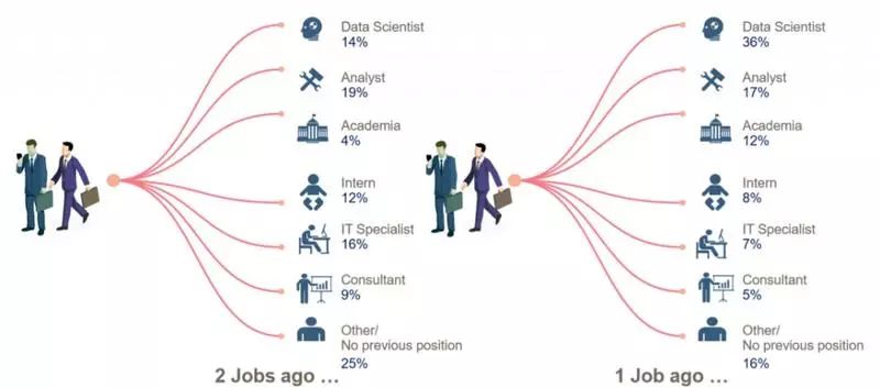 在现实当中,很少有公司会直接正式招聘应届的数据科学家。他们大部分人都是从分析员(数据分析、BI 分析)、实习生、IT 专员、软件工程师和咨询顾问做起的。只有 2% 的人在一开始就从事数据科学工作。