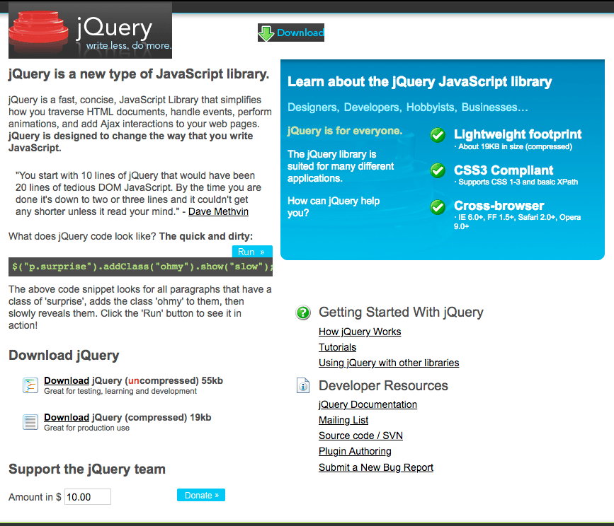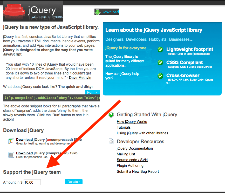 在这种情况下,许多开发人员会试图通过收集捐款来覆盖他们自己所花的时间和精力。例如,如果你回顾2007年的jQuery网站,请注意看,屏幕的左下方已经出现了一个捐赠按钮。