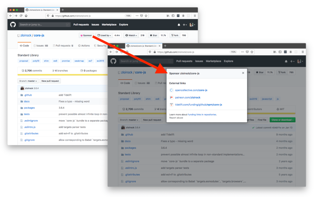 如果你试一下,就会发现GitHub会在你的仓库上显示一个“赞助商”按钮,列出了你的用户可以选择的所有赞助方式。例如,core-js 的GitHub库中的过程是这样的: