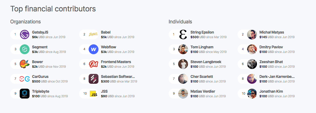 如今,非常多的项目都使用了Open Collective,包括Bootstrap和core-js。因为Open Collective上的捐赠是公开的,所以能够告诉你某些项目的实际收入是多少。例如,以下是Open Collective上给Bootstrap捐赠最多的一些组织和个人。
