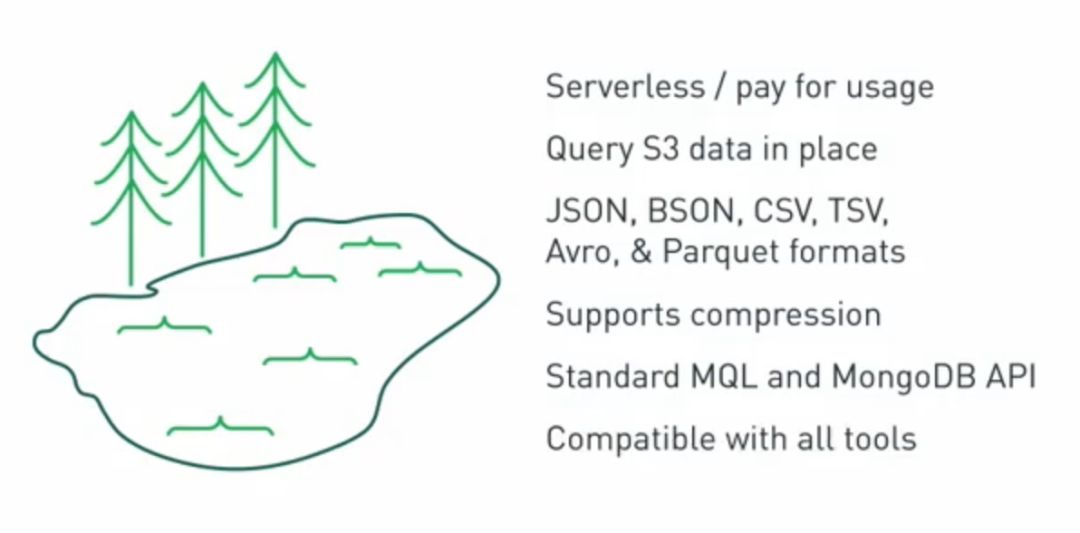 在新版本 Atlas 服务里,提供了 Atlas Data Lake,能直接通过 MongoDB API 访问存储在 AWS S3 (未来支持 Azure、Google 的存储服务)里的数据。