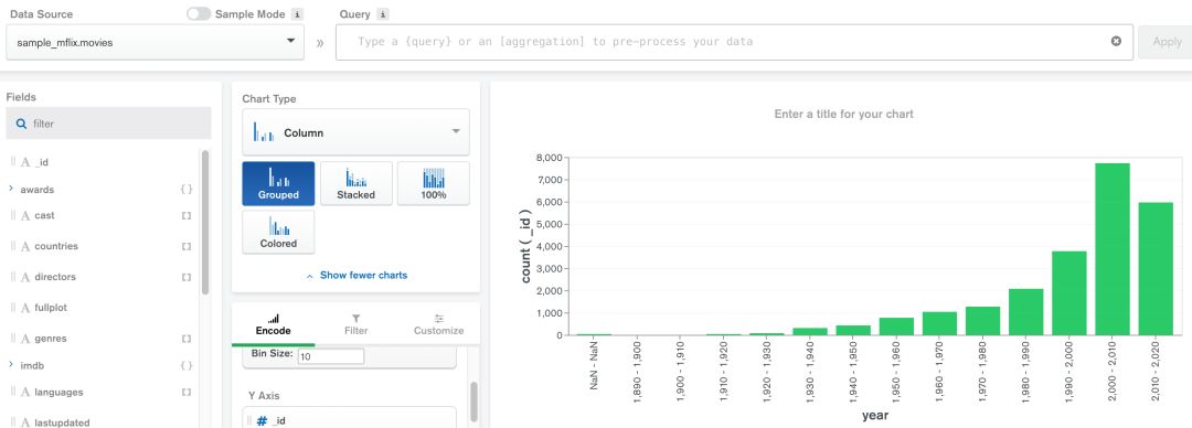 Charts 在使用上还是有一定学习成本的,不是特别直观,需要配合教程,了解下运作原理,才能得到想要的图,比如这个例子里,针对电影集合,Released 的年份做了聚合分析,得到分布图。