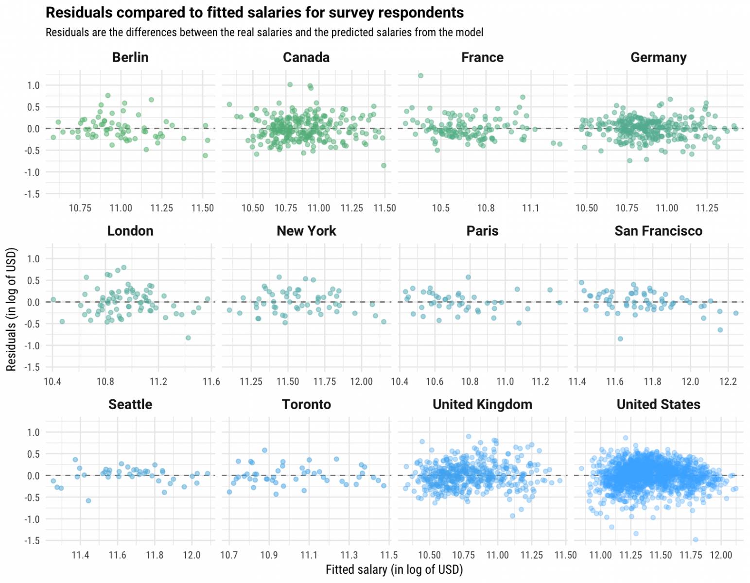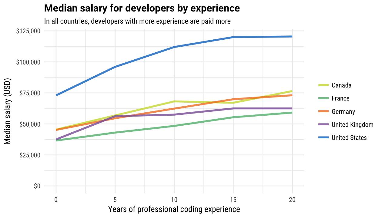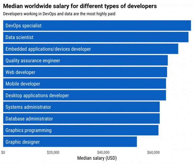 还有一个影响开发人员薪酬的另一个重要因素是他们工作领域以及他们所使用的编程语言/技术。例如,我们发现今年使用 React.js 或 AWS 的开发人员的工资明显更高。