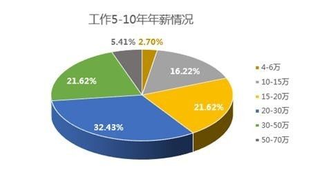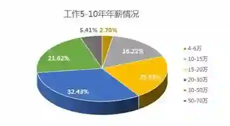 在工作 5-10 年后,只有 2.7% 的程序员年收入低于 6 万。年收入在 15-20 万的程序员占 21.62%,1/3 的程序员年收入在 20-30 万之间,超过1/5的程序员年收入在 30-50 万之间。年收入在 50-70 万的程序员占 5.41%。