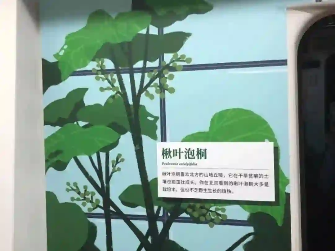 我仔细看了荒野气象台在地铁空间里展览的所有内容:手绘的北京夏季植物配合简短的科普文字——这和我在生活中的爱好一样:喜欢在路上观察各种花叶,不认识的就用软件扫描,下一次再遇到时会兴奋地辨认。身为一个待在北京的南方人,我以前觉得北京的春天并没有这么多花草,但最近发现,可能只是以前没有关心过这些吧?