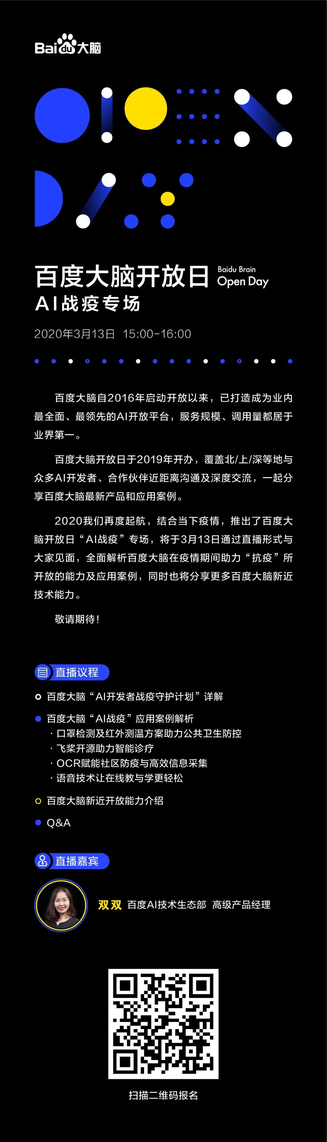 如果你想了解更多关于百度大脑的技术和应用案例,欢迎报名参加百度大脑开放日"AI战疫专场"!线上直播,助你快速学习。