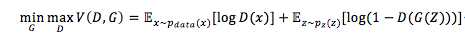生成网络G和鉴别网络D之间,进行着二元的极小极大博弈。首先,从图中可以看到D的输入是从训练数据或生成网络的输出进行采样:一半是训练集,一半是生成网络的输出。G为了生成样本,潜在向量从高斯分布采样作为G的输入。如果我们要生成一个200x200的灰度图,那么G的输出就是一个200x200的矩阵。目标函数如下,是一个标准的对数似然函数: