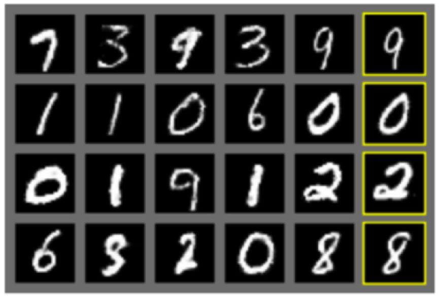图4引自Goodfellow等人,最右列(黄色方框内)是与其左方最接近的真实数据。其他所有图片均是生成的。