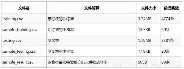 大家可以到竞赛官网查看赛题并下载数据集,数据集中主要包含下面几个文件,可见数据集很小也很简单,只需要使用training.csv文件进行训练我们的文本分类模型,使用testing.csv进行预测并提交结果即可: