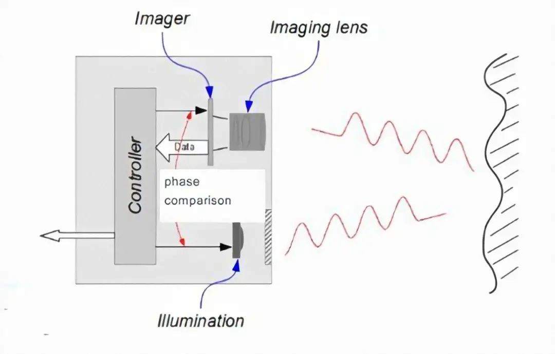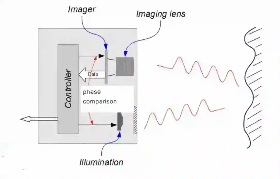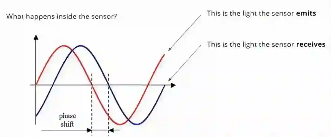 iToF 靠感知正弦波光信号的差异来「估算」其从发射到反射回来的距离。LiDAR 是激光直接测算距离。
