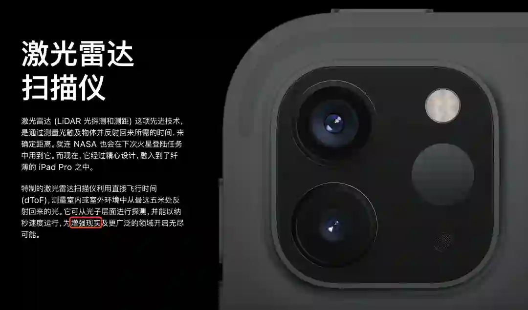 iPad Pro 2020 的官方网页上,苹果直截了当给出了答案,LiDAR 现阶段主要就是为 AR(Augmented Reality 增强现实)服务的。