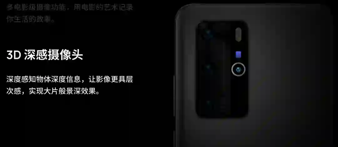 例如 P40 Pro 有一颗 3D 深感摄像头(ToF),可以深度感知物体深度信息,实现大片般的景深效果。