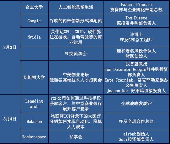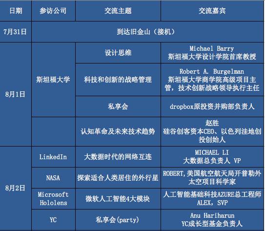 接下来的8天时间里,他们将开启一段对于未来的探索之旅,走访英伟达、Amazon Go、波音公司、NASA、奇点大学、斯坦福等近20家前沿企业或机构。著名华裔科学家张首晟、Airbnb创始人、波音公司中国区总裁等30余位硅谷著名投资人、企业创始人/高管将为学员带来精彩干货与思想碰撞。