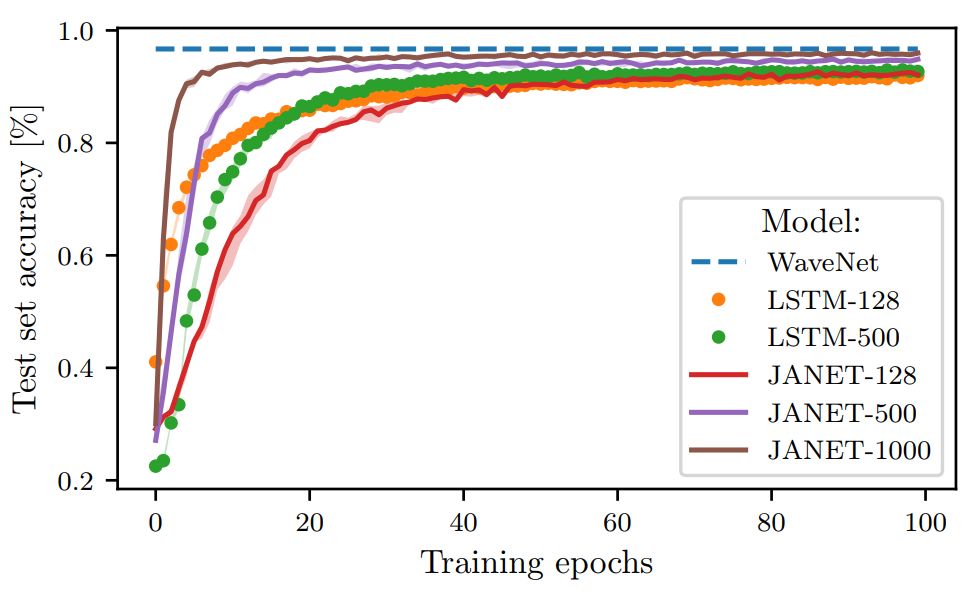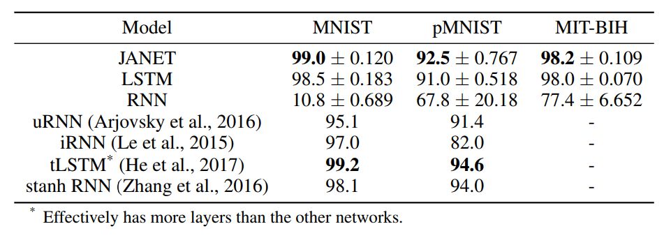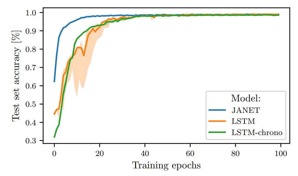 令人惊讶的是,结果表明 JANET 比标准 LSTM 的准确率更高。此外,JANET 是在所有分析数据集上表现最佳的模型之一。因此,通过简化 LSTM,我们不仅节省了计算成本,还提高了测试集上的准确率!
