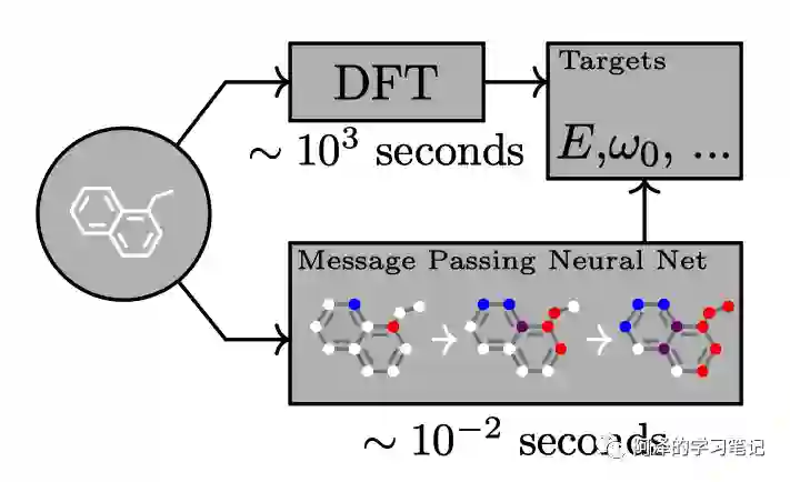 本文给出的一个例子是利用 MPNN 框架代替计算代价昂贵的 DFT 来预测有机分子的量子特性: