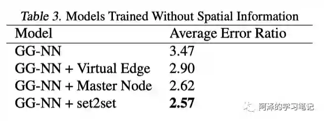 此外,作者也尝试了使用潜在的“主”节点(master node),这个节点可以通过特殊的边来连接到图中任意一个节点。主节点充当了一个全局的暂存空间,每个节点都会在消息传递过程中通过主节点进行读取和写入。同时允许主节点具有自己的节点维度,以及内部更新函数(GRU)的单独权重。其目的同样是为了在传播阶段传播很长的距离。